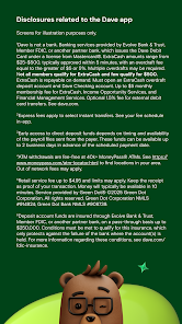 1-デイブは銀行ではありません。 Evolve Bank and Trust、メンバー FDIC、または Mastercard® のライセンスを通じて Dave デビット カードを発行する別のパートナー銀行によって提供される銀行サービス。 ExtraCash の金額は 25 ドルから 500 ドルの範囲で、通常は 5 分以内に承認され、5 ドルまたは 5% の大きい方の当座貸越手数料がかかります。複数の当座貸越が必要になる場合があります。すべてのメンバーが ExtraCash を受け取る資格があるわけではなく、500 ドルを受け取る資格のあるメンバーはほとんどいません。 ExtraCash はオンデマンドで返済可能です。 ExtraCash 当座貸越預金口座と Dave 当座預金口座を開設する必要があります。 ExtraCash、収入機会サービス、財務管理サービスの月会費は最大 5 ドルです。外部デビットカード送金にはオプションで 1.5% の手数料がかかります。